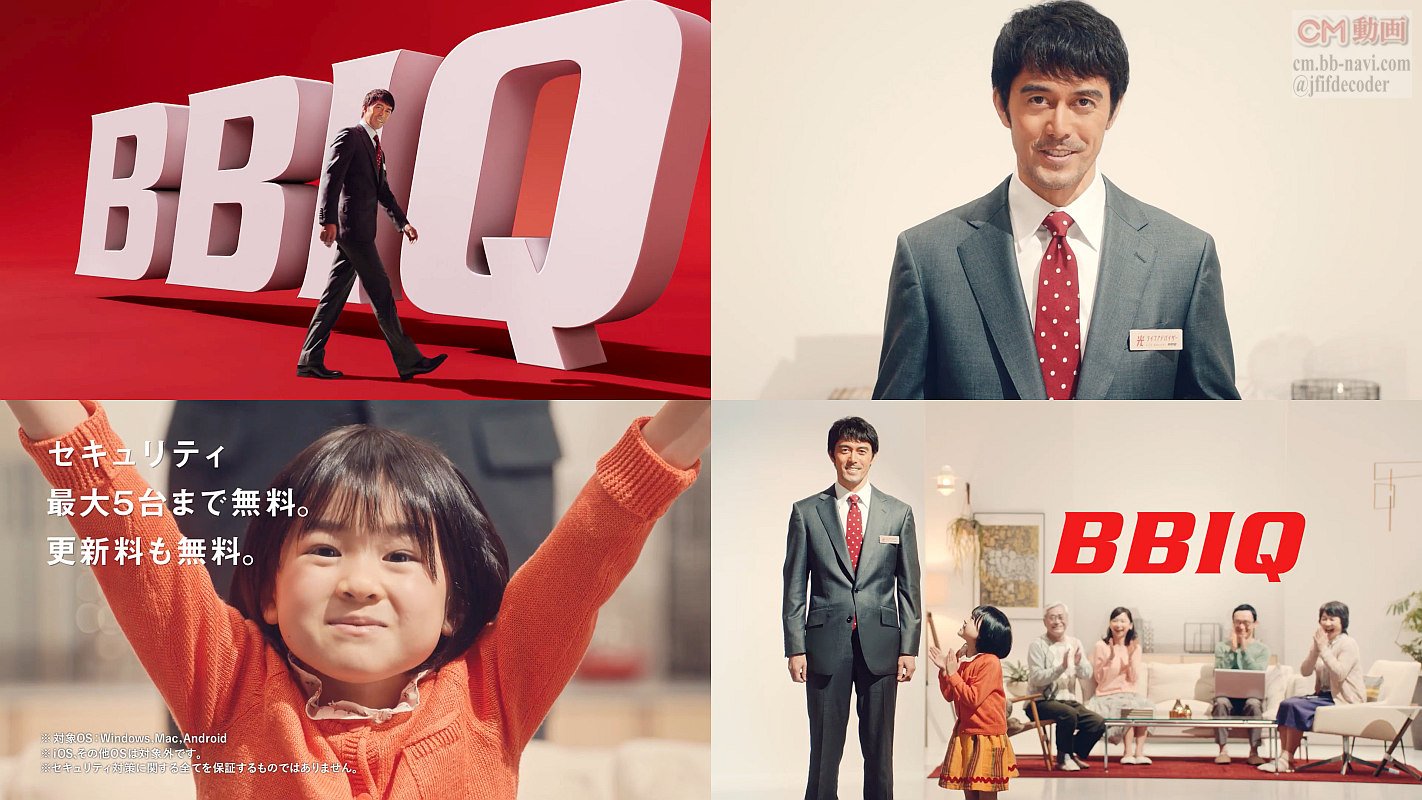 スーツ姿の俳優の阿部寛さんが「光は入った後が大切。」と登場し、Qの中へ入ると、インターネットを使うどこかのご家庭のリビングへとつながり、「だからBBIQは、家族みんなのパソコンやスマホをずっと…」と言おうとすると、女の子に「怖いウィルスからお守りします」とセリフを横取りされてしまい、「それ、僕のセリフだよ」と言うCMです。