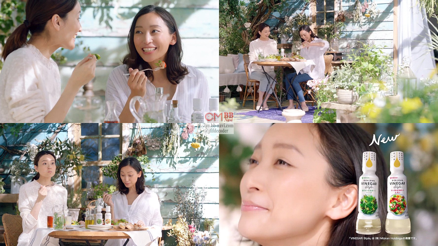 女優の杏さんと友人が、庭のテラスでサラダランチをして「オリーブオイルに、アップルビネガー」「ゴマ油に、白ワインビネガー」と ビネガースタイルをかけて「いただきます」と食べて「う〜ん。あう〜」「野菜おいしい〜」と言う、ミツカン ビネガースタイル(VINEGAR Style)のCMです。