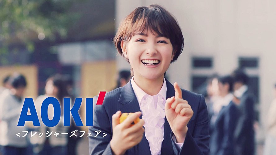 初めてのスーツを着た葵わかなさんが「初めてのスーツってドキドキだ」を丁度1秒で言えるようにチャレンジして「あ、1秒3」「あああ、97。アハハハ」と盛り上がる、AOKIの短い6秒のCMです。