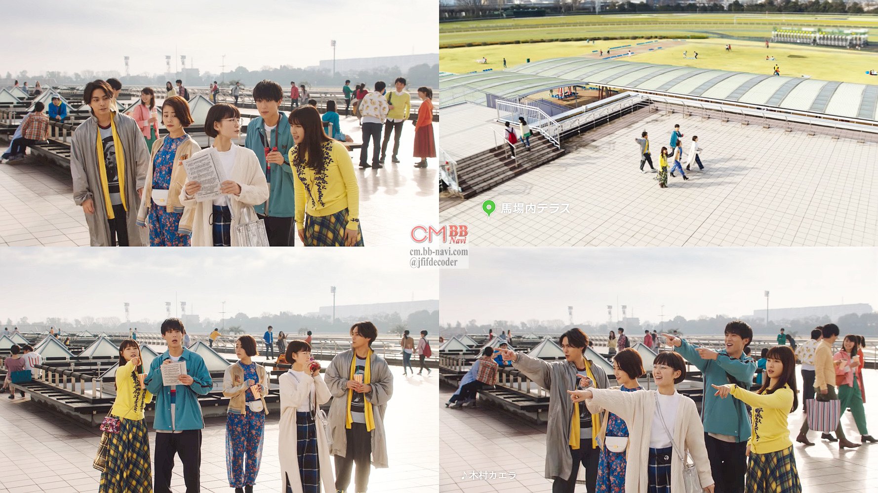 競馬場の馬場内テラスに上がってきた土屋太鳳,高畑充希,中川大志,葵わかな,柳楽優弥の5人が、「スタートが… あそこ」「で、ゴール」と、各レースのスタート地点と、ゴール地点を皆で確認する、JRA 2019年4月7日桜花賞のCM。