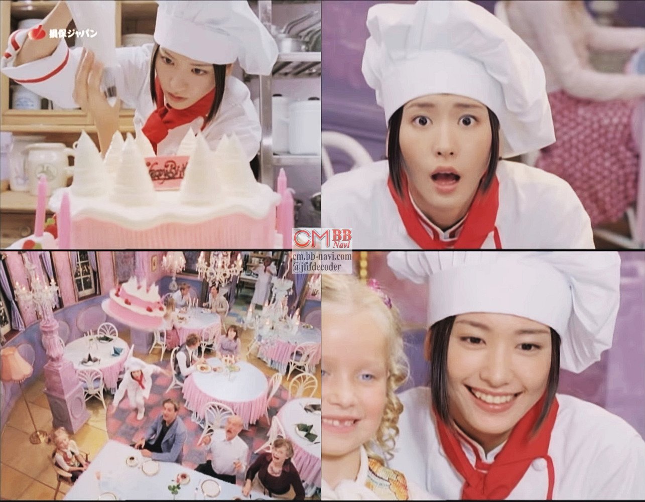修行中のケーキのパテシェ役の新垣結衣さんが作った、女の子バースディケーキを、イスにつまづいて飛ばしてしまったら、なんとも芸術的なイルカのデザインのケーキになったと言う内容です。