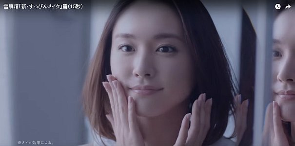 女優の新垣結衣さんが、砂浜を歩きながら「雪肌精のCCクリームはね」「素肌まできれいになるんだよ」「塗ってるほうが、肌にいいんだって」と微笑みながら語り、鏡の前でCCクリームを塗って「すごいでしょ」と言うCMです。