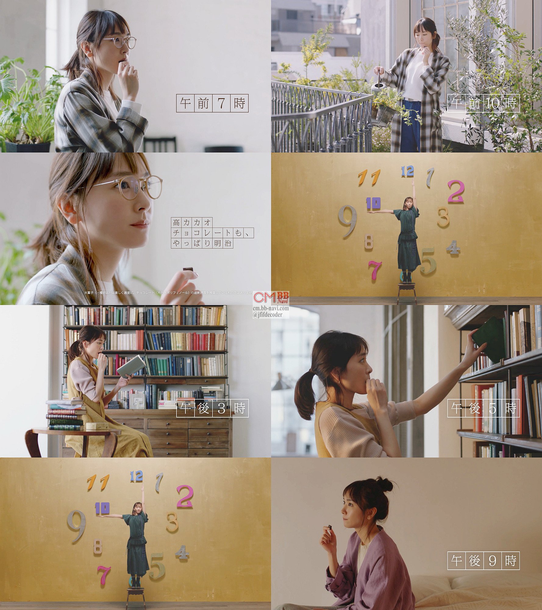 女優の新垣結衣さんが「ポッポー」と鳩時計になって午後3時を告知し、健康を考える人になってチョコを食べる、明治チョコレート効果の短い6秒のCMです。