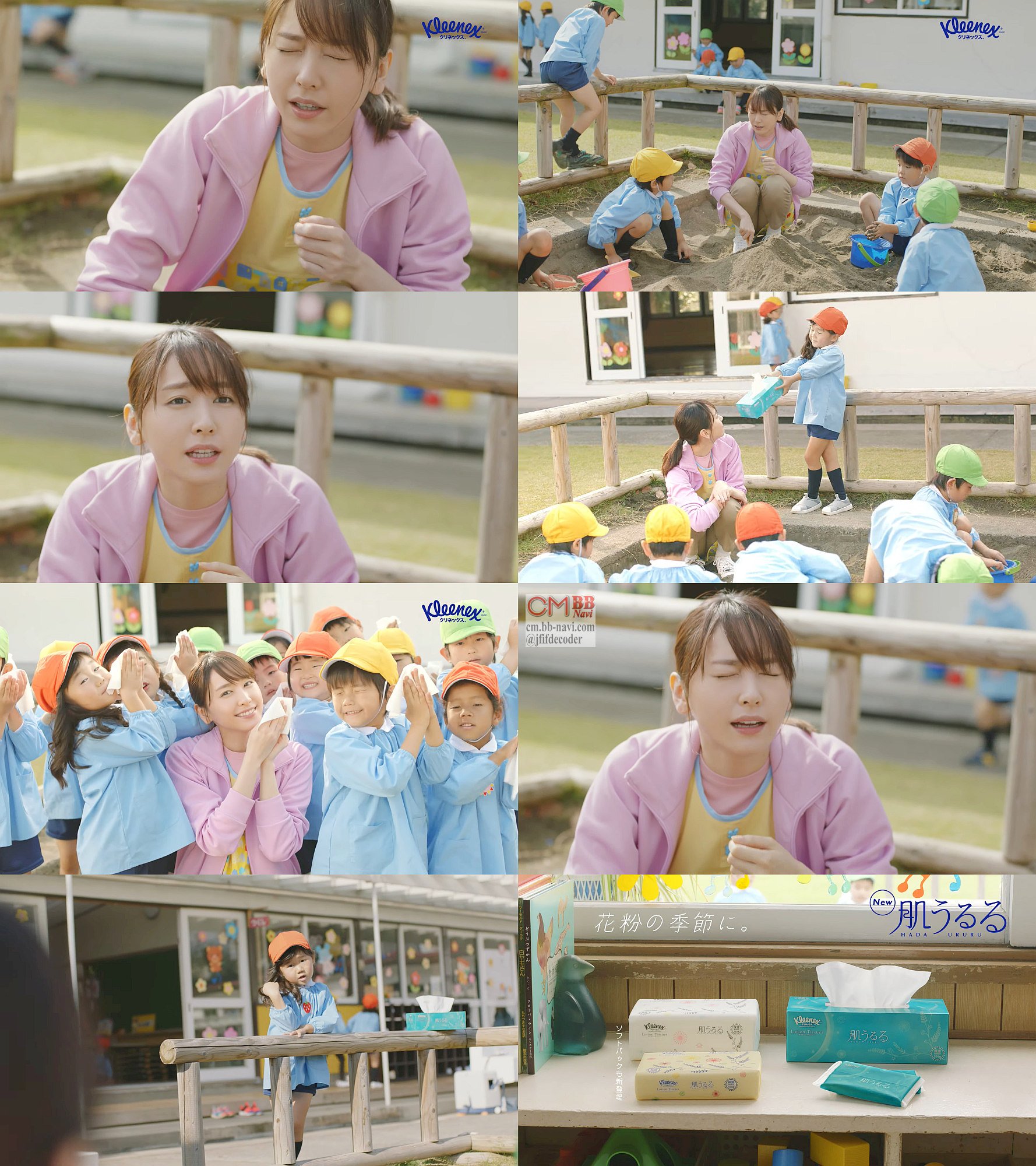 幼稚園の先生役の女優の新垣結衣さんが、砂場で園児達と砂遊びをしてると「くしゃん」とくしゃみをすると、園児の男の子から「花粉症?」と聞かれ「違いま…(くしゅん)」とまたくしゃみをして、他の園児の女の子から「わかるわ〜 認めたくないその気持ち」と言われ、「ただのくしゃみで…(くしゅん)」とまたくしゃみしてしまい、女の子が「認めなさいよ」と言いながらクリネックス ローションティッシュ 肌うるるを差し出し、最後は園児達全員で「うるる」と言います。