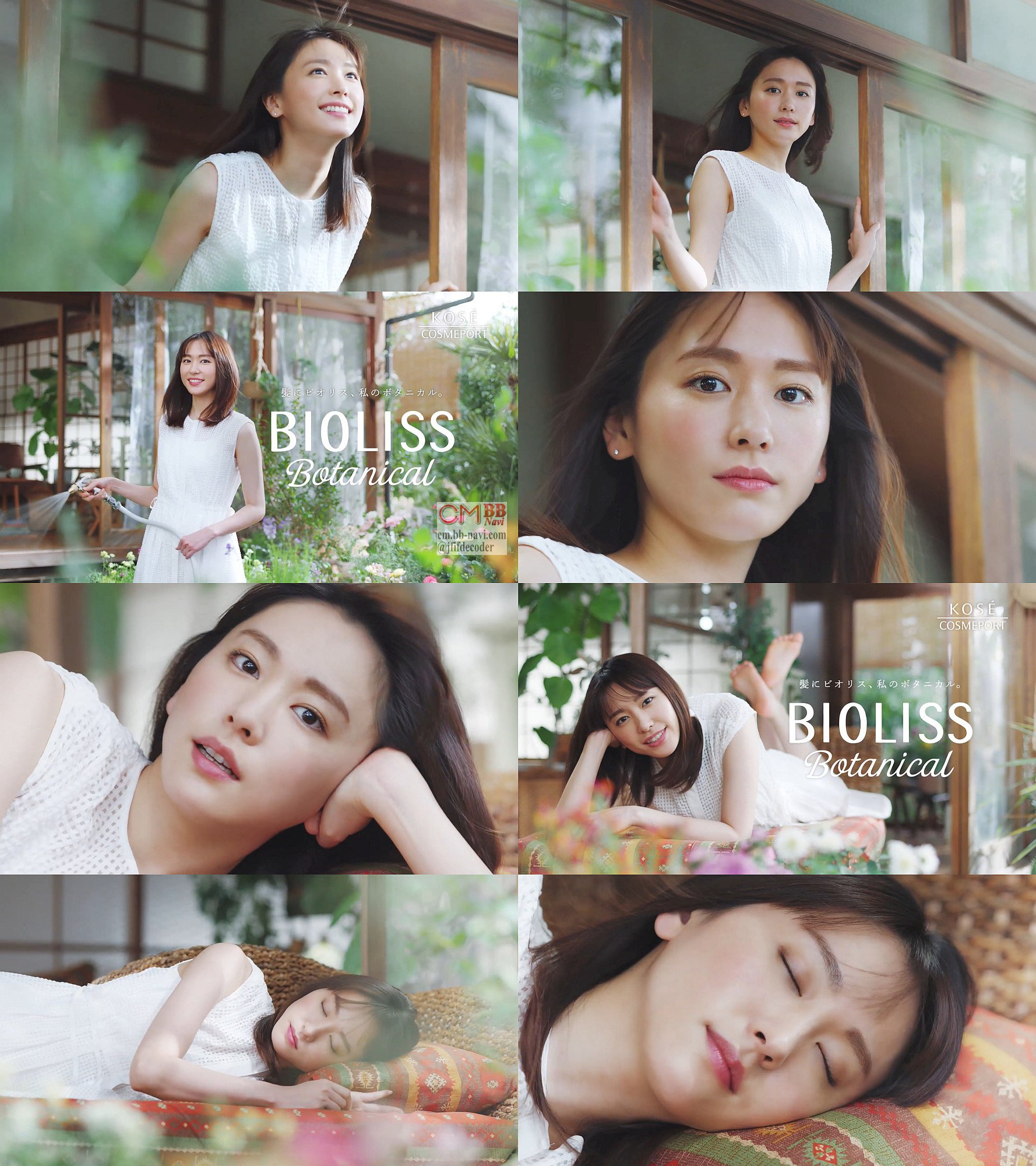 袖の無い白のワンピース姿で素足の女優の新垣結衣さんが、縁側で昼寝してるとそよ風に髪が揺れて、女性が「新垣さんの髪って、なんで綺麗なんだろう。なんで?」と思ってると、新垣結衣さんに見つかってしまって「何見てるの?」と言われてしまい、最後は新垣結衣さんが縁側で横になって「私のビオリス」と言います。