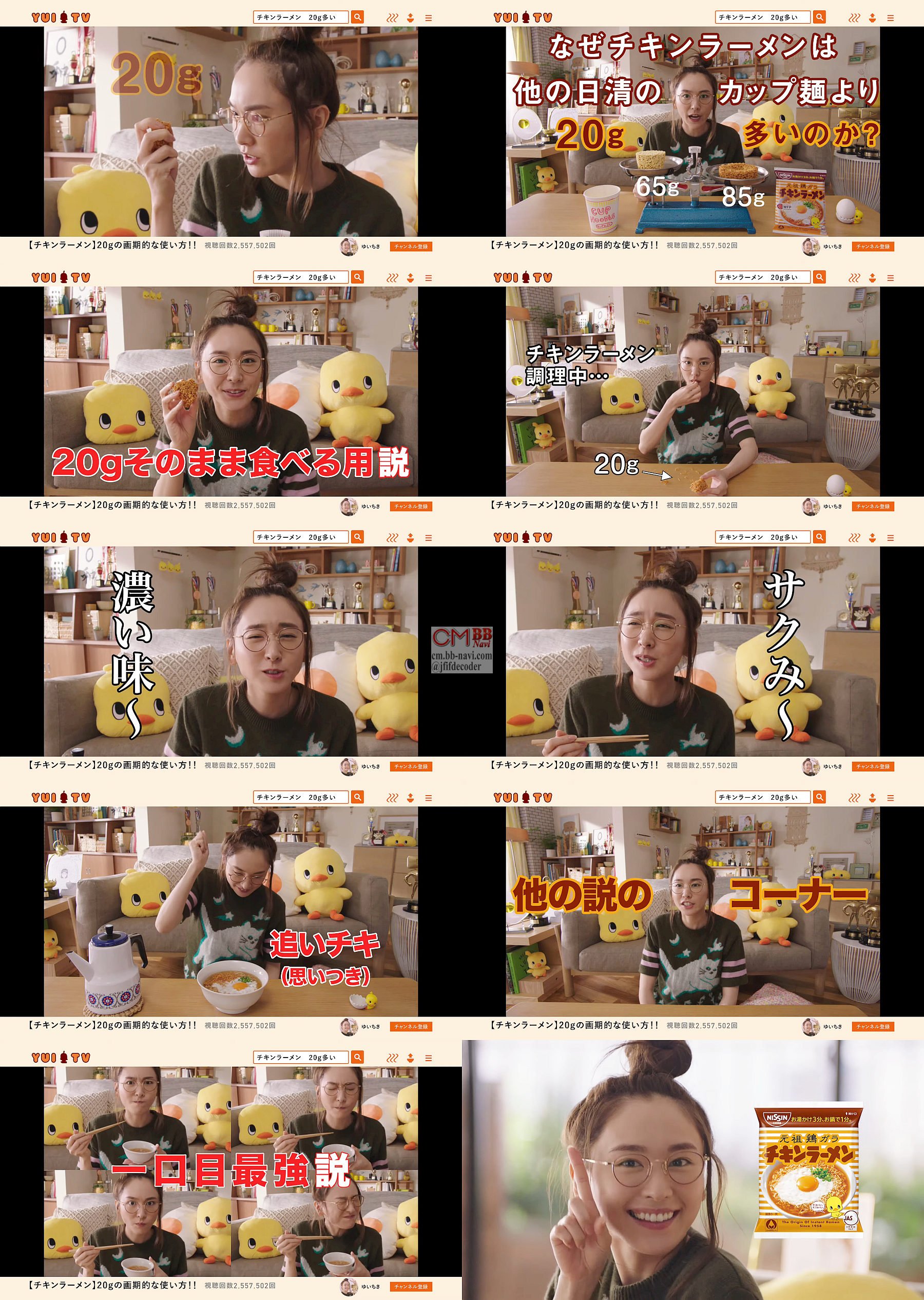 「どうも、ゆいちき」ですとユーチューバー風に再び登場した猫の柄のセーターを着たメガネ姿の女優の新垣結衣さんが、カップヌードルは65gなのに対し、チキンラーメンは85gの理由を、「実はこの20g そのまま食べる用説」と「3分待ってる間にちょうどいい」とパクパク食べたり、あまったチキンラーメンを追いチキで食べたりして、「はい、じゃあ誰か他の説知ってる人?」「巷の説も要チェック」「よかったらチキンラーメンよろしくね」と言います。