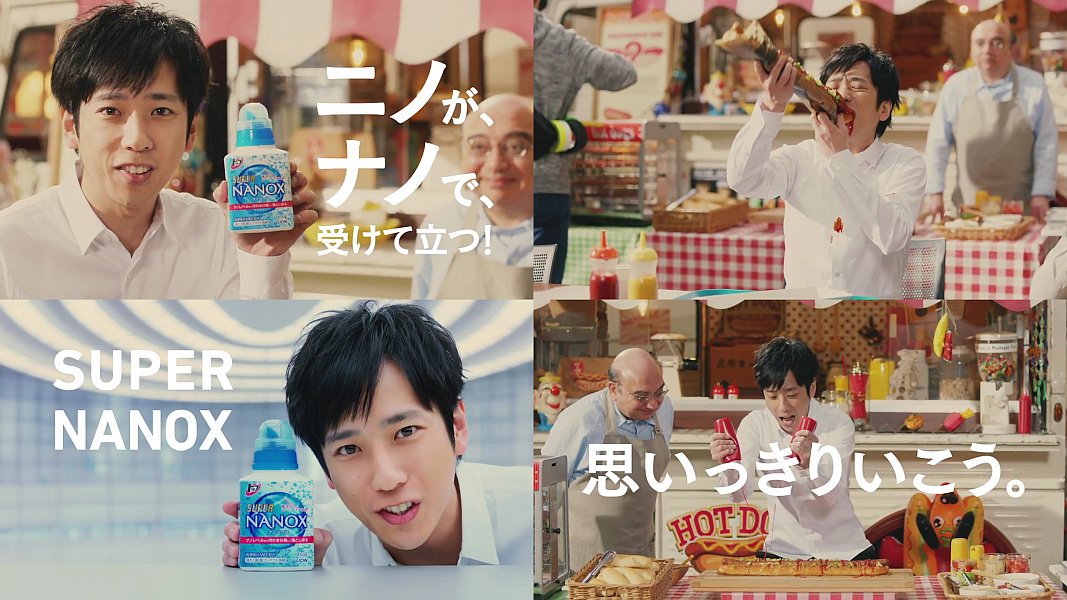 ケチャップを大量にかけた長いケチャップましましドッグと共に挑戦状が現れ、嵐の二宮和也さんがケチャップましましドッグを白シャツで食べ、洗濯して、汚れがキレイに落ちて、最後は「思いっきりいこう」とケチャップ2本でかけまくる、トップスーパーNANOXのCMです。