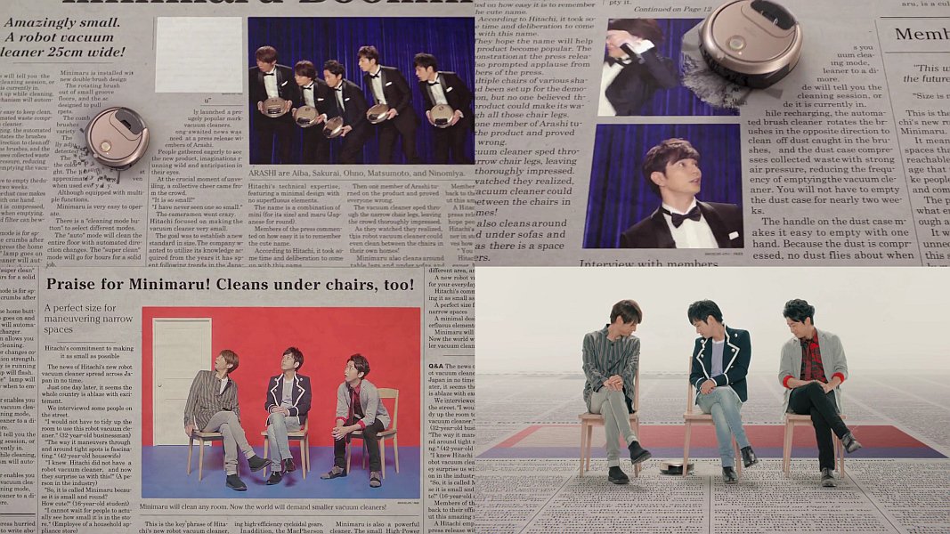 日立のミニマルデビューの英字新聞の記事になったタキシード姿の嵐の記事の上を、日立ロボットクリーナーのミニマルが動いて記事をキレイに消していき、最後は大野智さんがミニマルの電源を落として抱え「いいでしょ」と言うと、メンバーが「いいね」と返す、日立ミニマルのCMです。