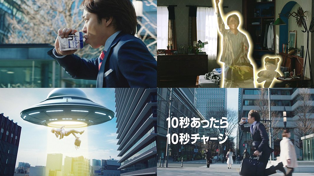 サラリーマン役の嵐の櫻井翔さんが、朝寝坊してしまって、会議が始まる10秒前である事に気づき、テレポーテーションで瞬間移動する妄想をしてしまい、ウイダーinゼリーを食べながら会社へと走るCMです。