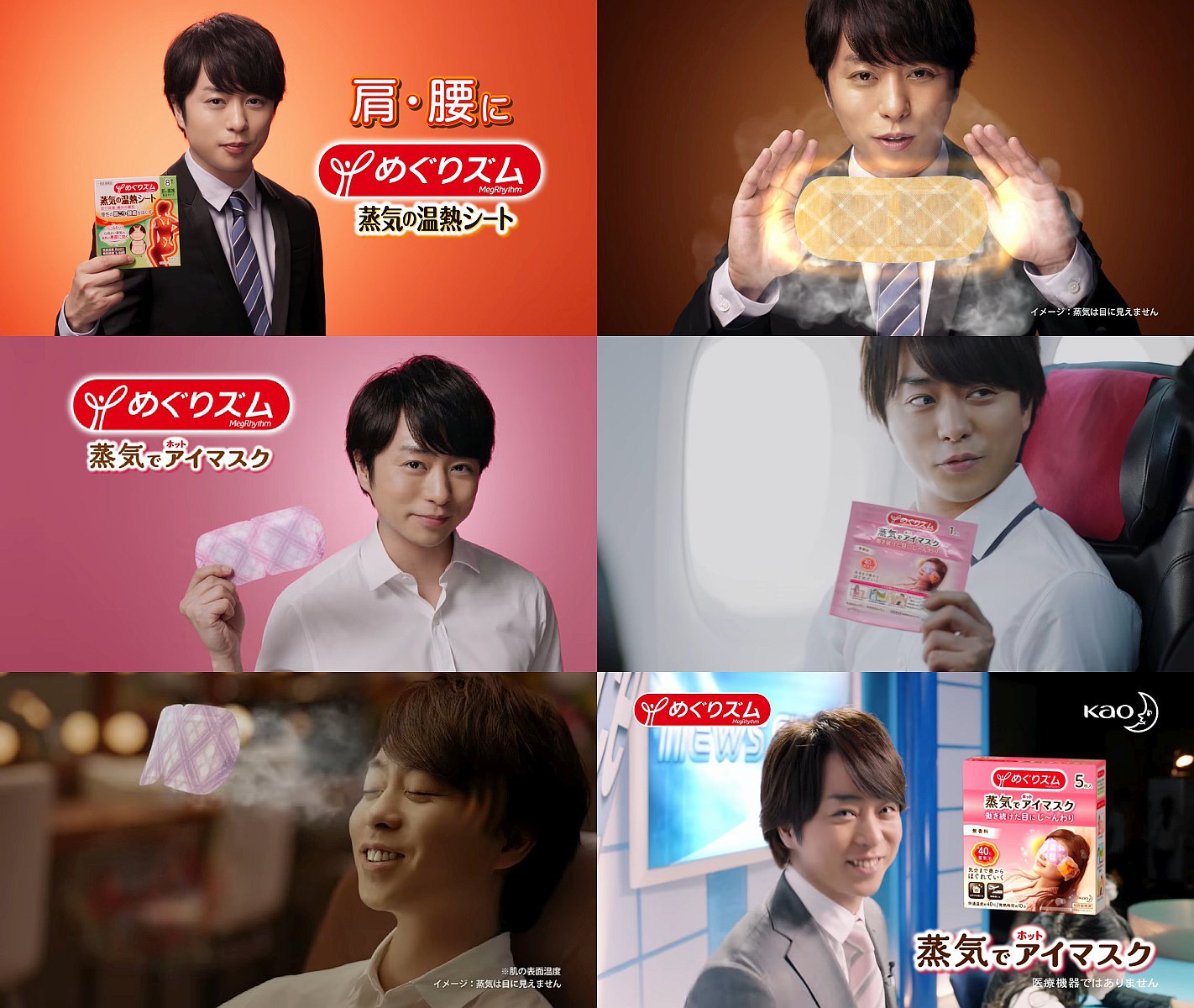 スーツ姿の嵐の櫻井翔さんが「肩、腰に、めぐりズム」と登場し、肩こりや腰痛で悩んでる人達に、「その凝りや痛みに」「温熱が深〜く温め、血行を促進。肩こり、腰痛をほごします。」と紹介する、花王めぐりズム 蒸気の温熱シートのCMです。