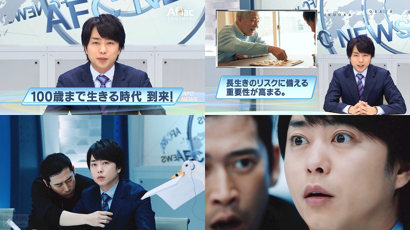嵐の櫻井翔さんがニュースキャスター役で「100歳まで生きる時代がもうすぐ来るそうです」とニュースを紹介し、CMの間に「僕は100歳まで生きたら、あと65年近くか…」と考え、「長っ」と驚く、アフラックの100歳まで生きる時代シリーズのCMです。