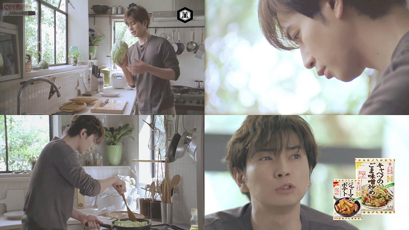嵐の松本潤さんが、長袖のシャツをまくって、キッチンでキャベツを切って、キャベツのごま味噌炒めを作って食べる、キッコーマン うちのごはんのCMです。