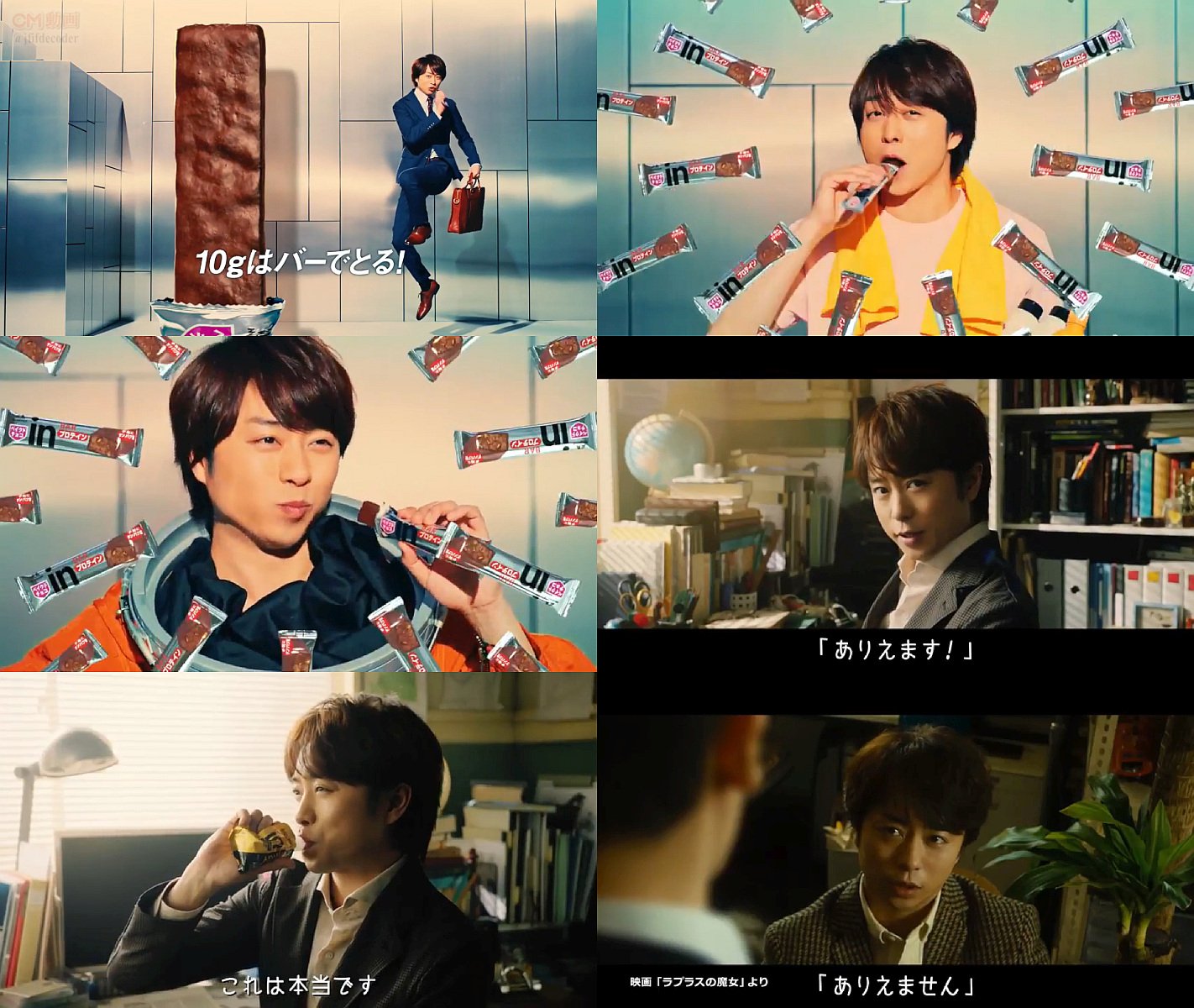 inゼリー スーパーエネルギーを飲むと、「億万長者になる」「猫と喋れる」「予知能力が使える」の問いかけに、嵐の櫻井翔さん主演するラプラスの魔女コラボの「ありえません」「ありえない」のシーンで答え、最後に櫻井翔さんが「ありえます」と森永製菓 inゼリーを食べてもうひと頑張りするワンカット「これは本当です」を追加したCMです。
