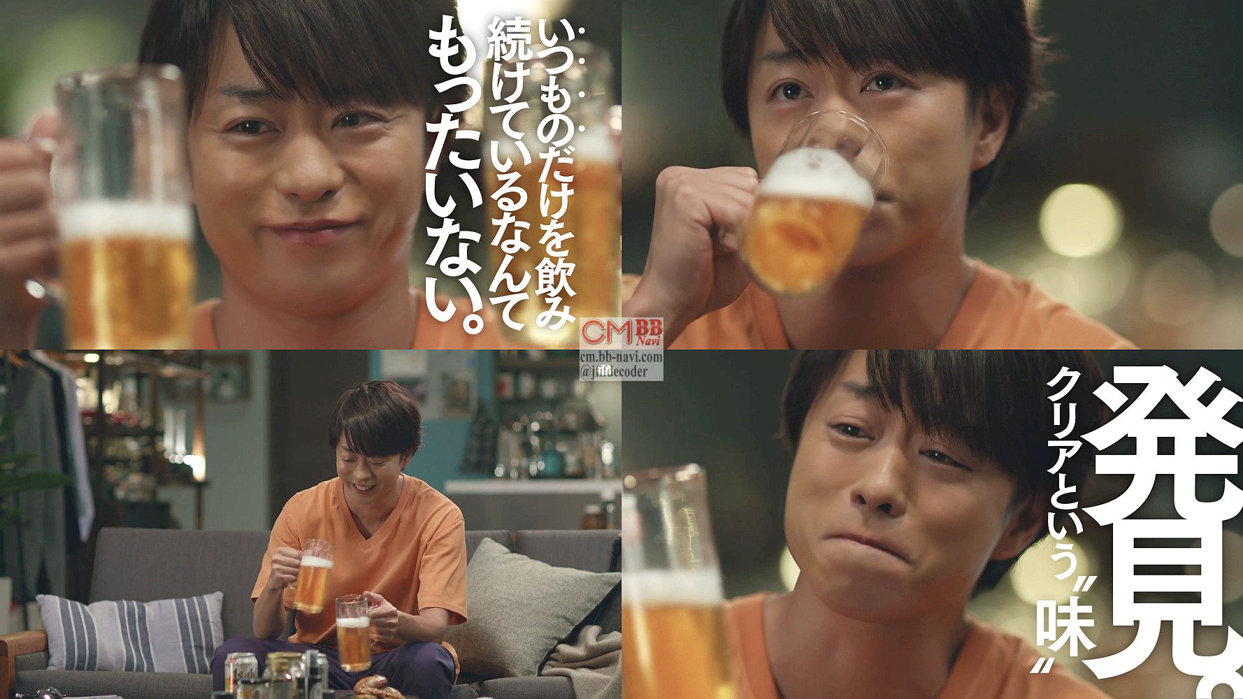 嵐の櫻井翔さんが「飲み比べしよう♪飲み比べしよう♪」のCM曲で、自宅でジョッキに注いだクリアアサヒといつものとを飲み比べして「発見。クリア、と言う味」「いつものと比べてみません?」と言う、クリアアサヒのCMです。