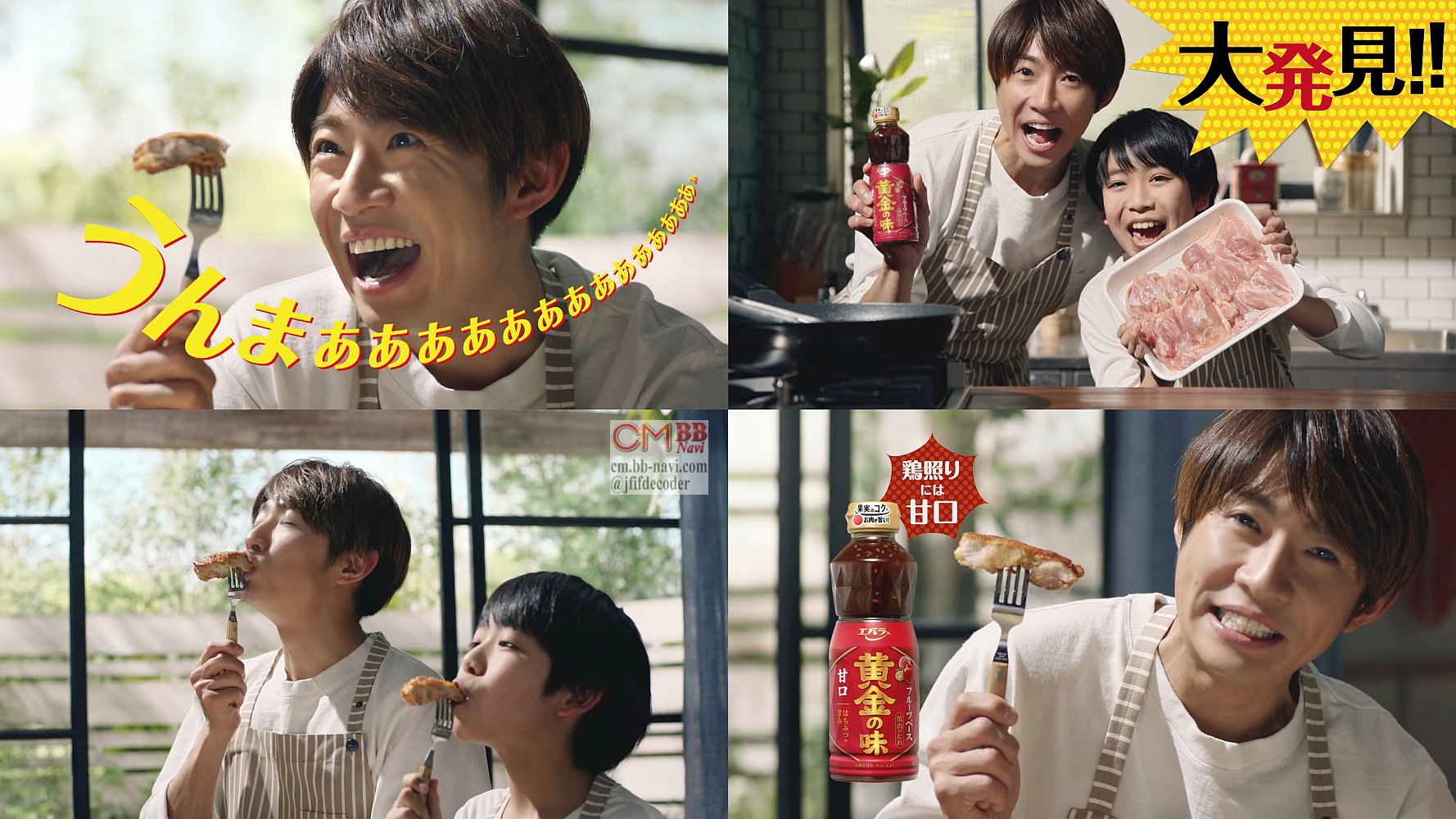嵐の相葉雅紀さんが男の子と一緒に「黄金の甘口と鶏肉で大発見」とキッチンで黄金鶏照りを作って「うんまぁぁぁい」と食べ、「鶏照りには、甘口」と言う、エバラ 黄金の味のCMです。