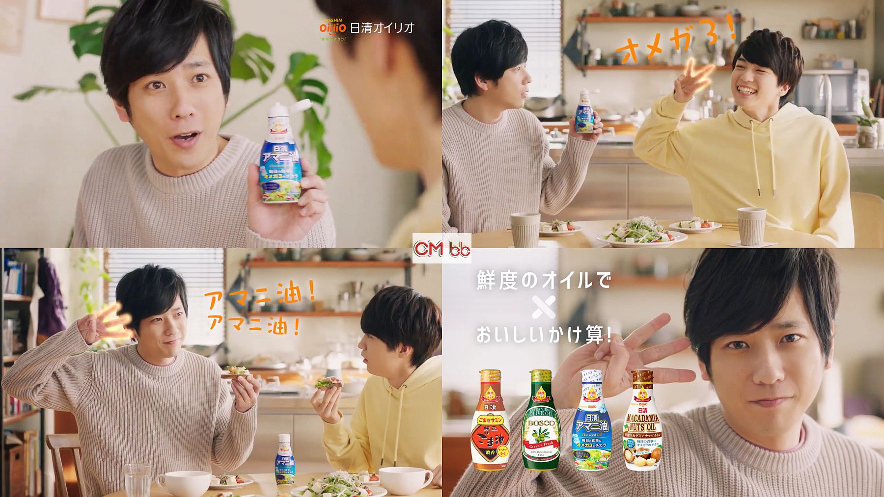 嵐の二宮和也さんが「アマニ油と言えば」と言うと、関西ジャニーズJr. の西畑大吾さんが「オメガ3」と指を3本立ててポーズ。そして今度は二宮和也さんが「だからクセになるアマニ油」と指を3本立ててポーズする、日清オイリオのCMです。