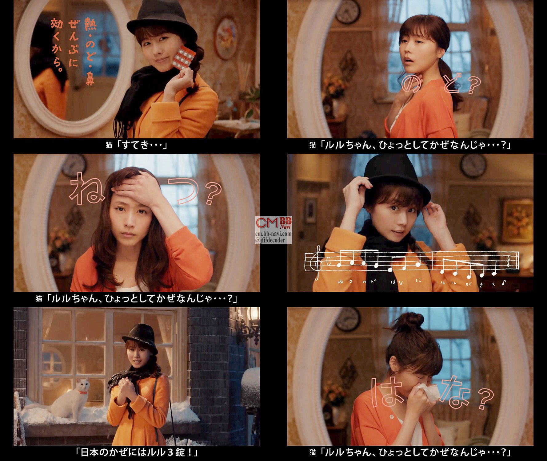 オレンジの服を着たルルちゃん役の女優の有村架純さんが、おでこに手を当てたリ、くしゃみをしたり、して白猫のピエールが「ルルちゃん、ひょっとして風邪なんじゃ?」と失敗し、出かけようとした有村架純さんに「おでかけルルシート、忘れないで」と言って、帽子をかぶって「熱・のど・鼻に ルルが効く♪」と歌い、ルルシートを手に「どう?」「日本の風邪にはルル三錠」と言う、第一三共ヘルスケア 新ルルAゴールドDXのCMです。