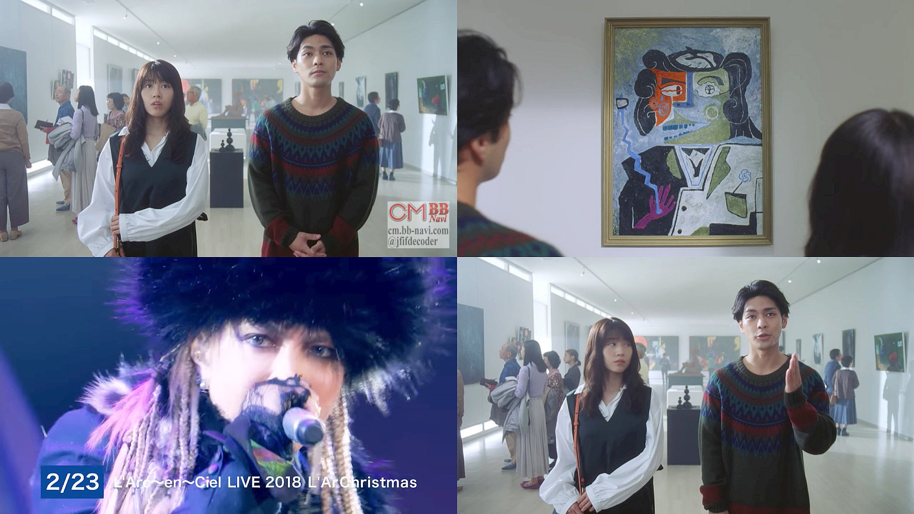 俳優の柳楽優弥さんと女優の有村架純さんが美術館デートで、壁に飾ってある抽象画の絵を、彼女役の有村架純さんが「不思議な絵」と言うと、彼氏役の柳楽優弥さんが「これはWOWOWに入りたい気持ちを表現してる」と答え、WOWOWで放送されるL'Arc〜en〜Ciel LIVE 2018 L'ArChristmasが映像と共に告知されます。