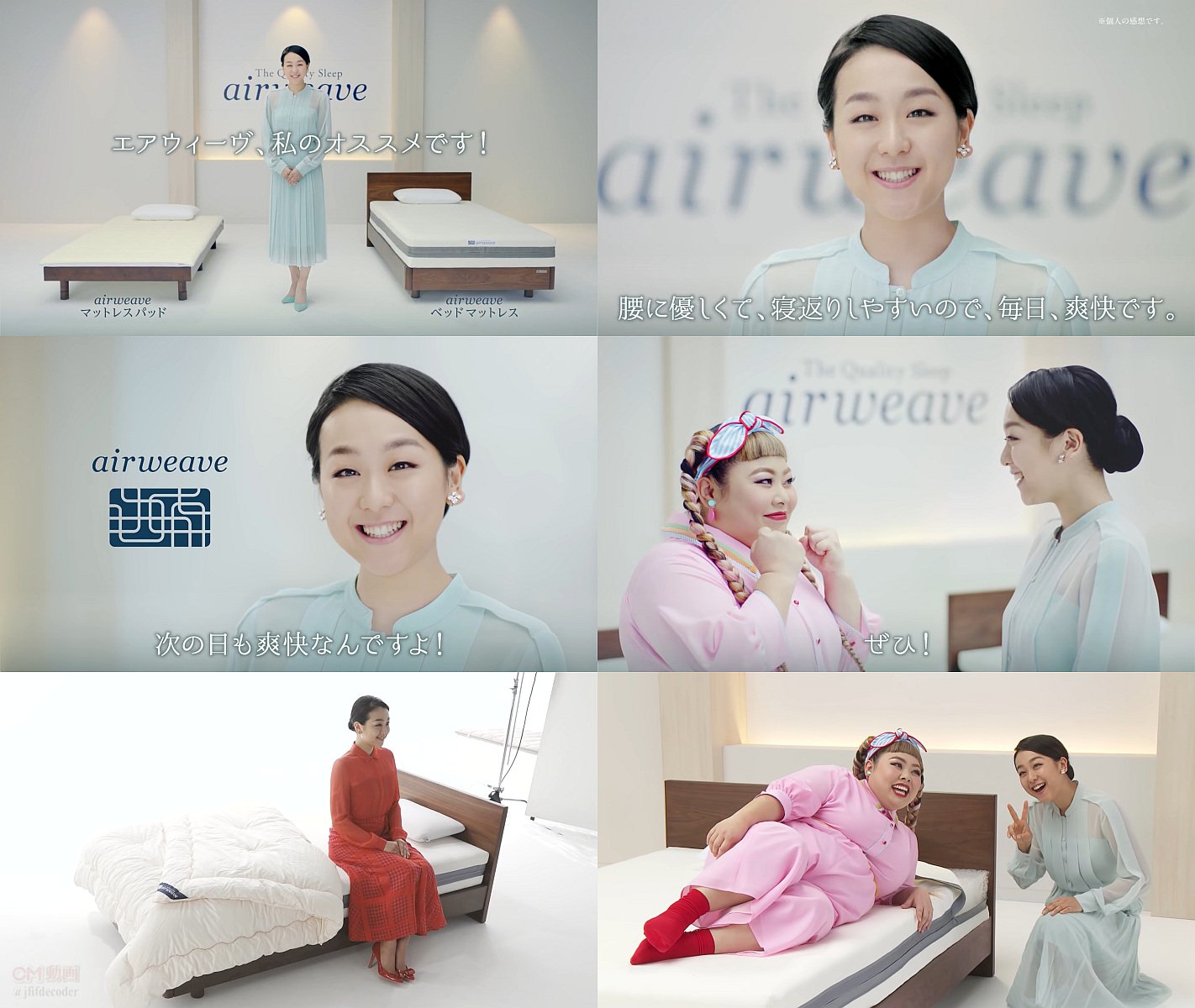 浅田真央 エアウィーヴ CM 浅田真央 紹介篇 more 終了浅田真央 エアウィーヴ 企業・ブランド放送開始画質時間メイキングお勧め画像通知 airweave2018年6月HD16s●hq/sd 浅田真央 出演 エアウィーヴ CM浅田真央 紹介篇「エアウィーヴのマットレス、気持ちいいんですよ」 淡い水色の透けるワンピース姿の浅田真央さんが、「エアウィーヴのマットレス、気持ちいいんですよ」と言って、その秘密のマットレスの中のエアファイバーを紹介するCMです。浅田真央さん、ちょっと女性的にふっくらしてきた感じですね。Youtube airweave公式チャンネル 浅田真央CM Update:2020/01/31 Edit:2020/01/31 「エアウィーヴのマットレス、気持ちいいんですよ」