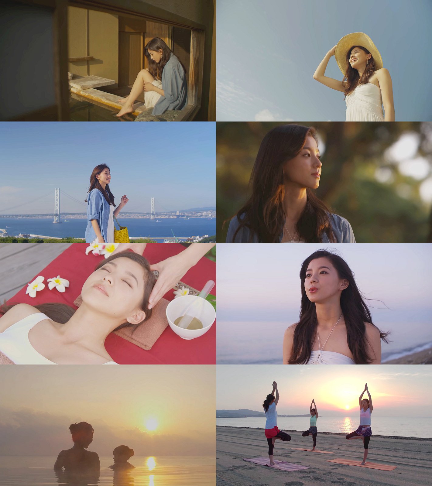 淡路島(兵庫県洲本市)出身の女優の朝比奈彩さんが、ホテルニューアワジでマッサージされたりしてリラックスしてリゾート気分になって「身も心も、淡路に染まる」と語り、朝陽が昇る海辺を歩きながら「ホテル ニュ〜アワジ♪」と歌うCMです。