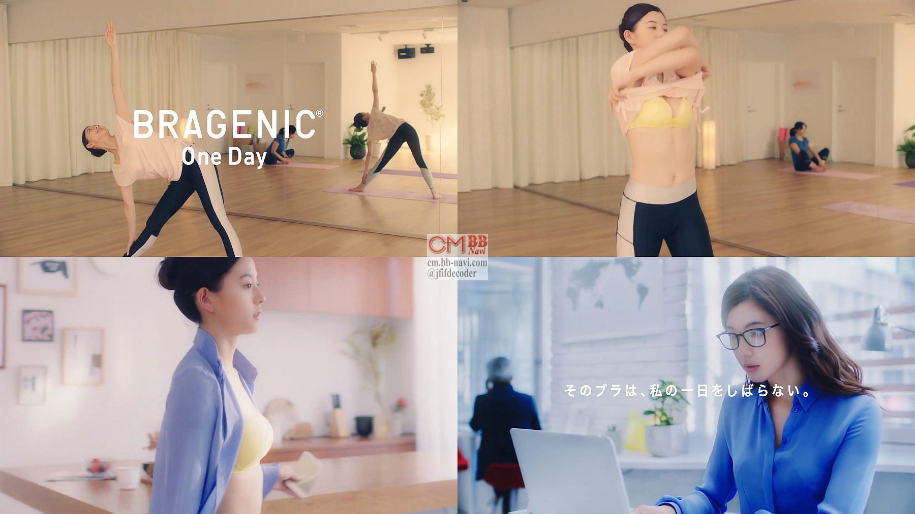 デモルで女優の朝比奈彩さんが、ストレッチをしてトレーニングシャツを脱いで黄色いブラ1枚になって、青いシャツを着て、オフィスに出勤して仕事をこなる女性を演じる、ワコール BRAGENIC One DayのWeb CM 30秒版。