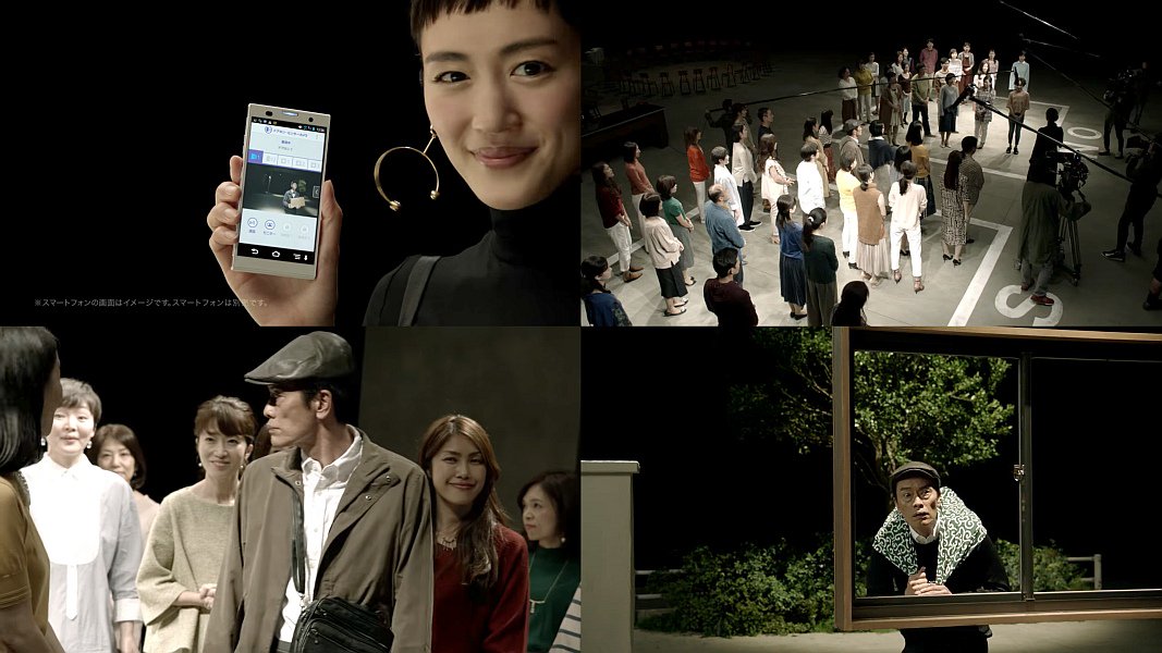 綾瀬はるかさんが、「玄関ベルが鳴ると、外出先でもスマホで応対できちゃう。」「そんなドアホン、欲しいですか?」と大勢の人に聞くと、YES と NO のグループに分かれ、NOとYESの理由を聞くCMです。遠藤憲一さんは一般ピープルに混じってYESのほうにいて「いいな、外でもドアホン」と言います。