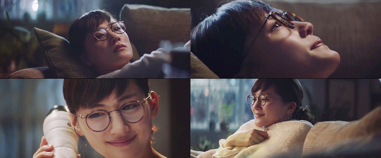 まんまるメガネをした女優の綾瀬はるかさんが、ソファの上で涙を一滴流し、「リュクスなリュクスなオードリュクス」と言って微笑み、レノアオードリュクスの香りをかいで「頑張る私へ、贅沢な香り」と言い、洗濯機に入れ、いい香りのタオルに包まれて癒される、 レノアオードリュクスのCM改訂版です