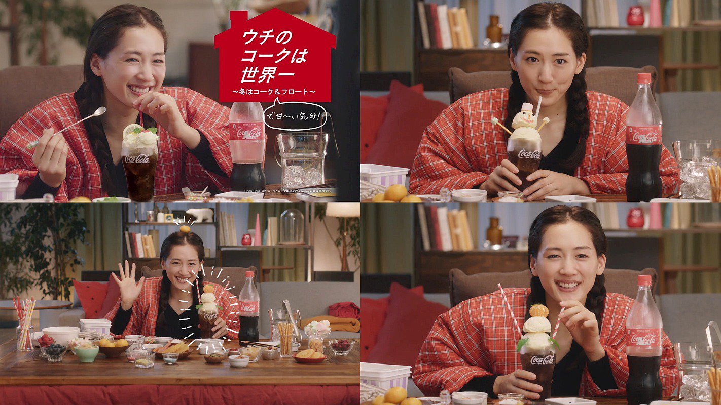 ちゃんちゃんこ(はんてん)姿の女優の綾瀬はるかさんが、コタツに入って、雪だるまや鏡餅風などの、デコ・コーク&フロートの作り方を紹介する、ウェブ限定の長編CMです。