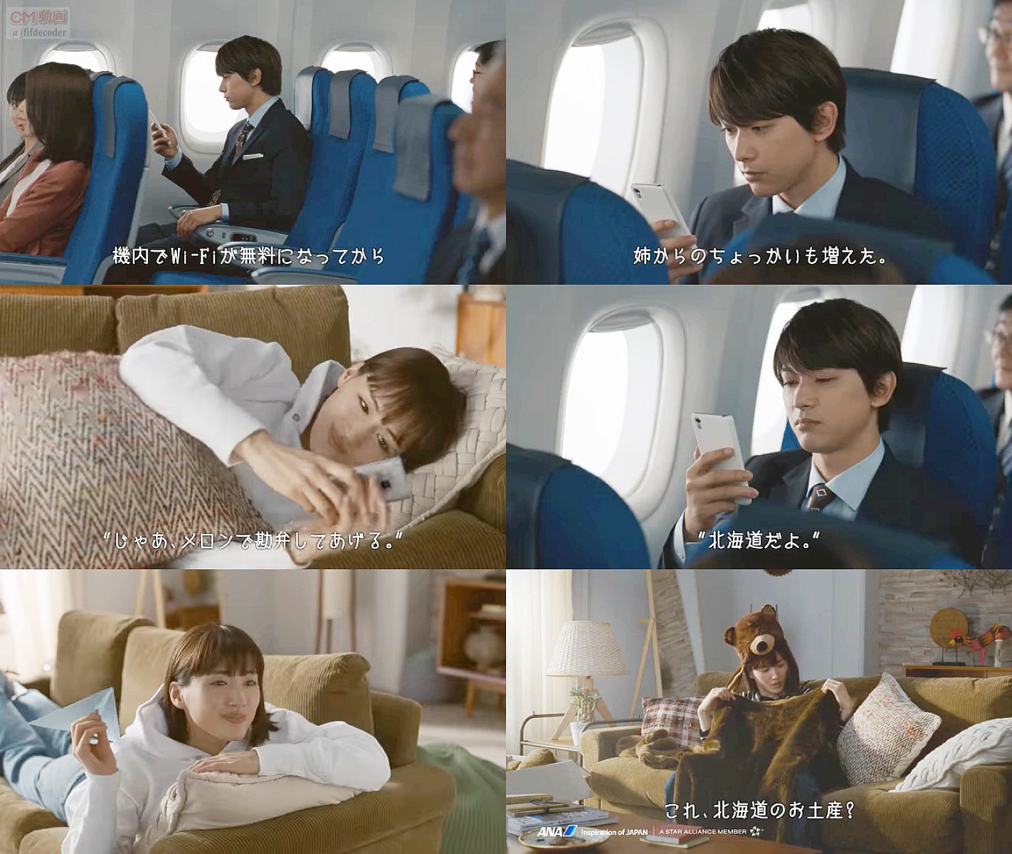 弟役の俳優の吉沢亮さんが飛行機の機内から姉役の女優の綾瀬はるかさんと、スマホでチャットして、仕事で北海道出張のお土産をせがまれて、綾瀬はるかさんがクマの着ぐるみ?をお土産に貰って「これ、北海道のお土産?」と思うANAのCMです。