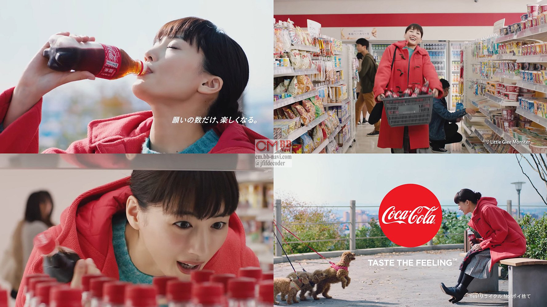 赤いダッフルコートを着た女優の綾瀬はるかさんが、コンビニでコカ・コーラ 福ボトルを見つけてカゴいっぱいにコカコーラを買って、コカコーラ福ボトルを飲んで「ワンチャン到来」とおみくじが書いてるのを見て、本当に犬(ワンちゃん)が寄ってくるCMとメイキング動画。