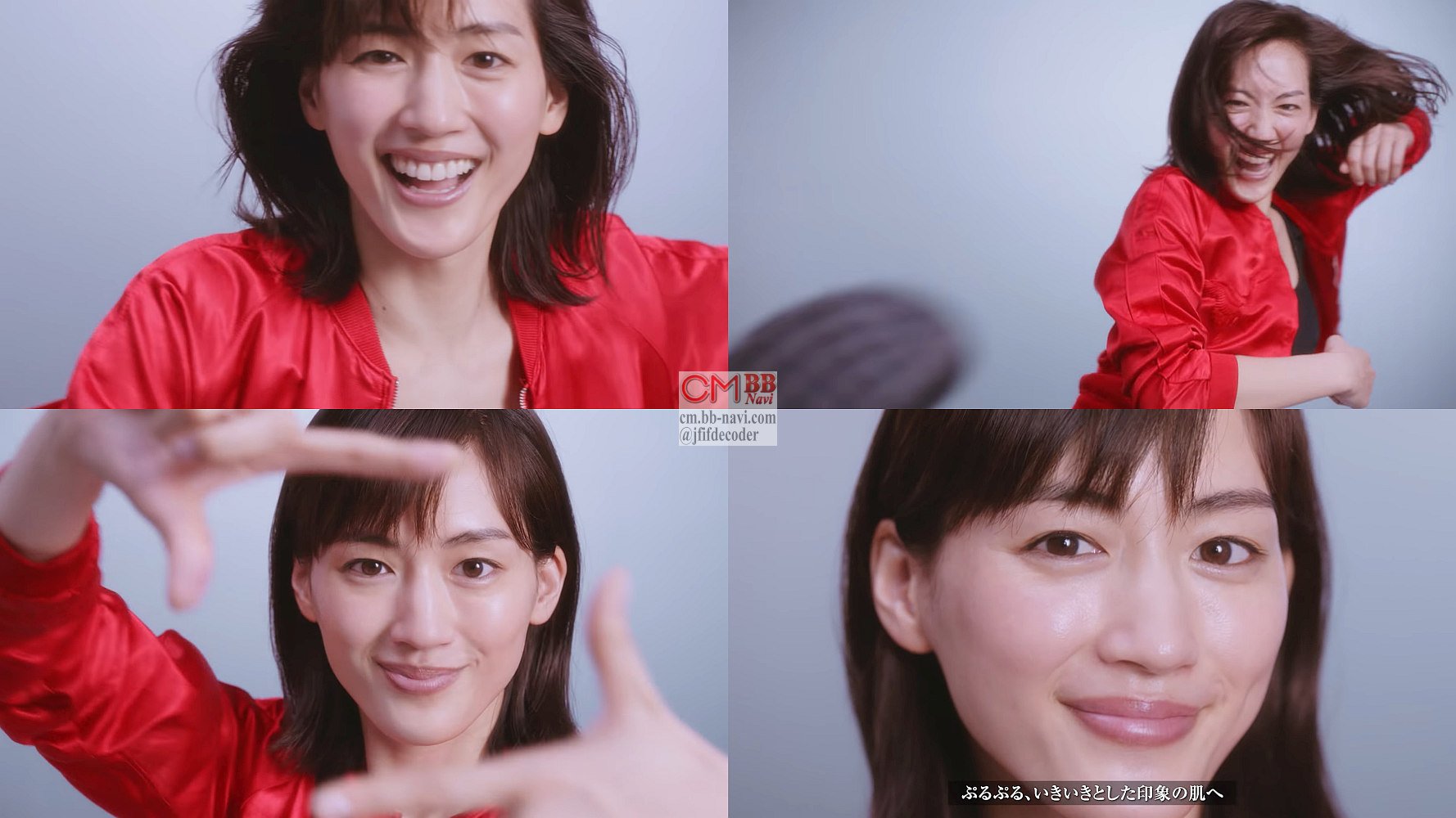 赤いジャンバーを着た女優の綾瀬はるかさんが、ポージングしたり指先で枠を作ったり、指先が発光したりし、「ぷるぷる、いきいきとした印象の肌へ」と語る、SK-IIのCMです。
