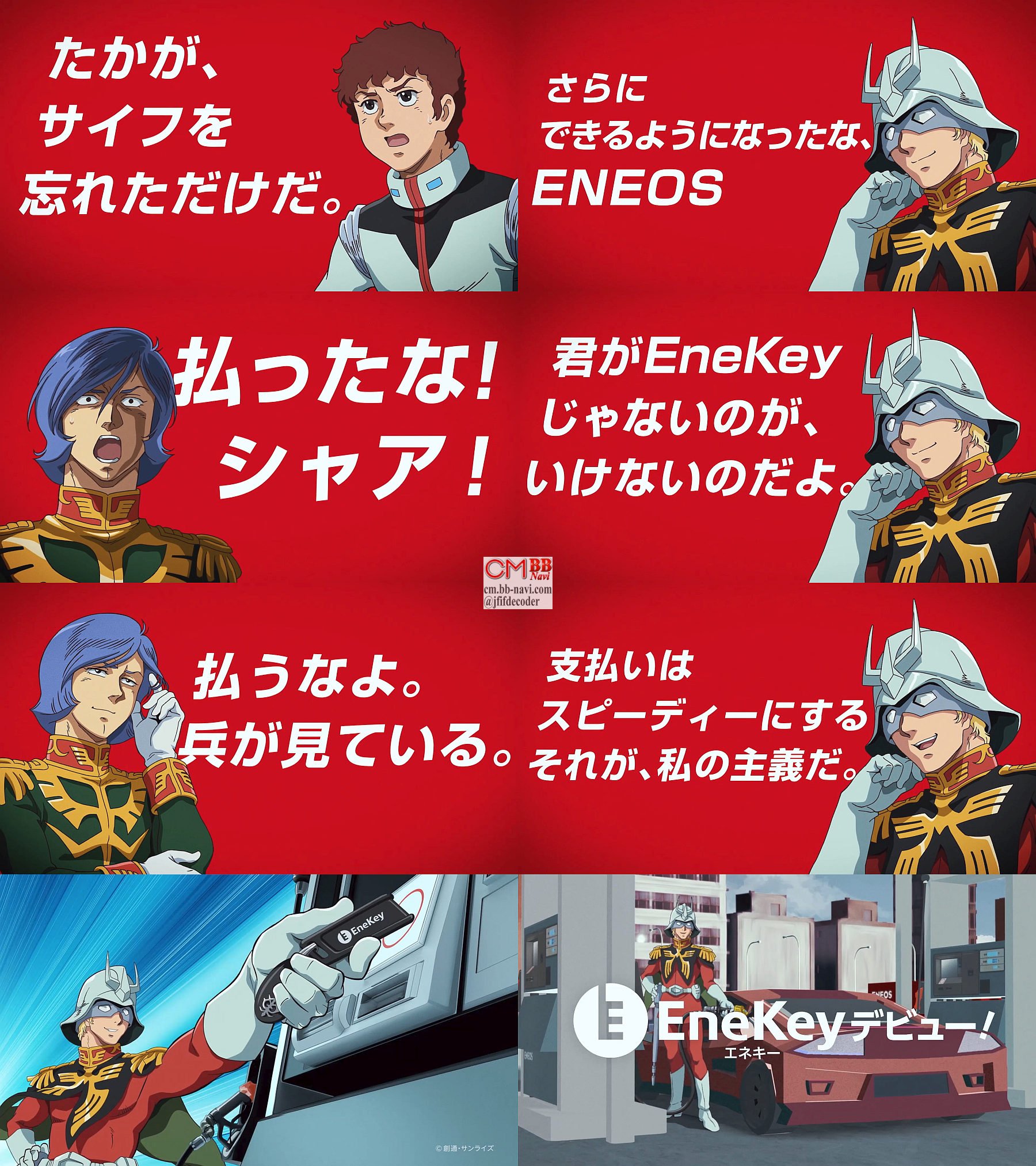 シャア(声優役は池田秀一さん)がアムロ(声優は古谷徹さん)と登場する、エネオス エネキー(EneKey)のガンダムコラボCMです。