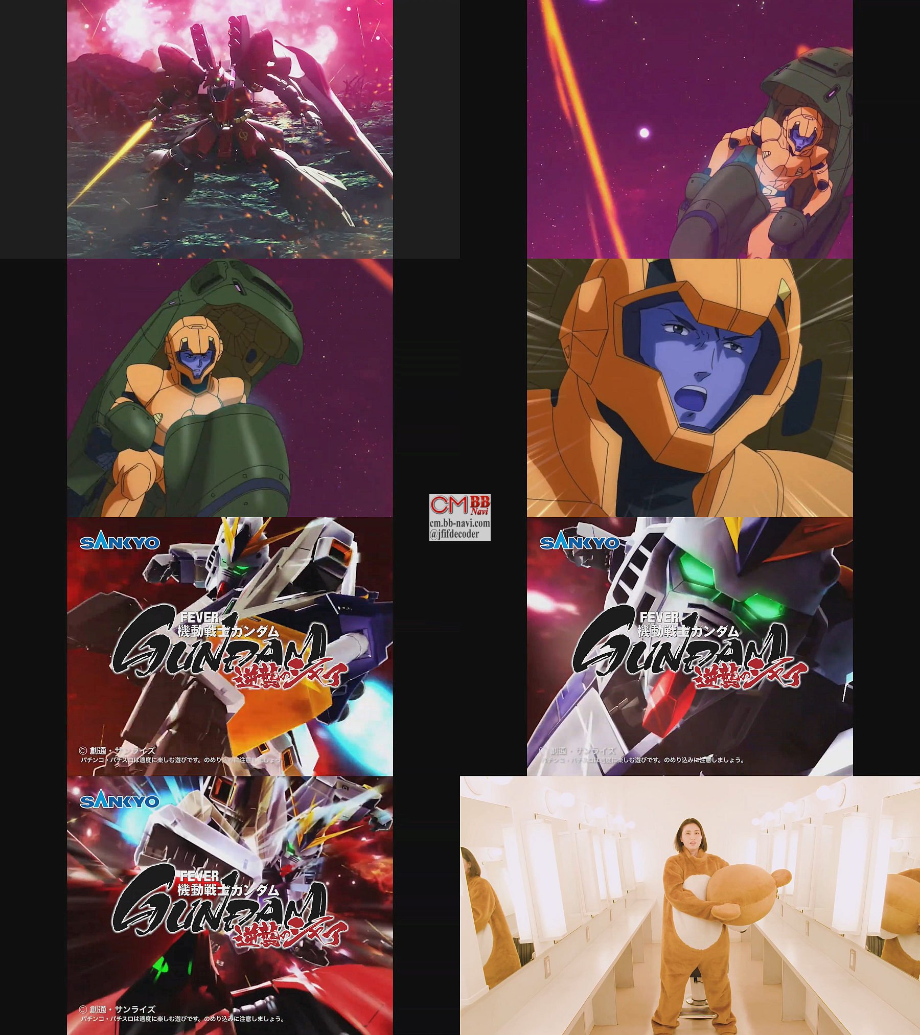 女優の橋本マナミさんがCMの衣装がクマの着ぐるみだという事で「もっとかわいい衣装ないの?」と愚痴る映像と、シャア・アズナブル(声優:池田秀一)が「地球上に残った人類などは、地上ののみだということがなぜわからんのだ」と言う、逆襲のシャアのシーンを使った、ィーバー機動戦士ガンダム 逆襲のシャアのCM 30秒版です。