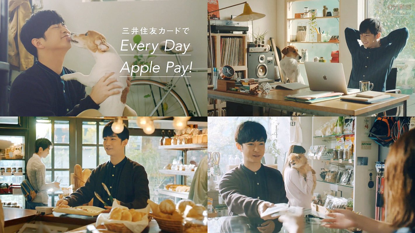 俳優の千葉雄大さんがペットの犬に「お留守番よろしくね」と財布を忘れて出かけて、犬が気づいて財布をくわえて吠えて、どうしようか困っていると、千葉雄大さんがパン屋で買い物をApple Payで払って済ませて帰宅し、心配していた犬がじゃれつき、熱烈にキスをする、三井住友カード Apple PayのCMです。