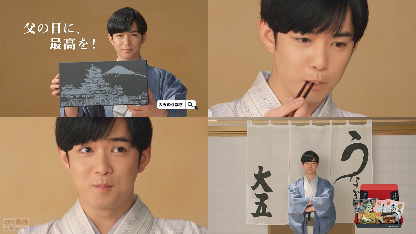 着物姿の俳優の千葉雄大さんが、大五うなぎ工房のうなぎ蒲焼を食べながら、「うなぎの本場静岡の、最高の香り、最高の艶、最高の味わい」と語り、最後に「大五のうなぎ。母の日に最高を」と言う大五通商のCMです。