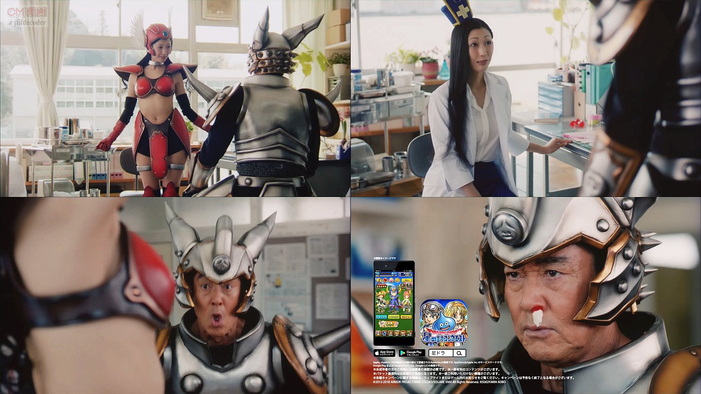 メタスラ装備の山下先生役の山下真司さんが、保健室の壇蜜先生のところにやってきて、「立派な装備」「これなら保健室に来ることも減るでしょう」と言うので、「寂しい… そういうことなら」と着ていた白衣を脱ぎ捨て、ボディに身に着けていた大胆なヘソ出しメタスラ装備をドーンと見せ「私も一緒に冒険します」と女戦士宣言をして、山下真司さんが鼻血を出してる、星のドラゴンクエストのCMです。