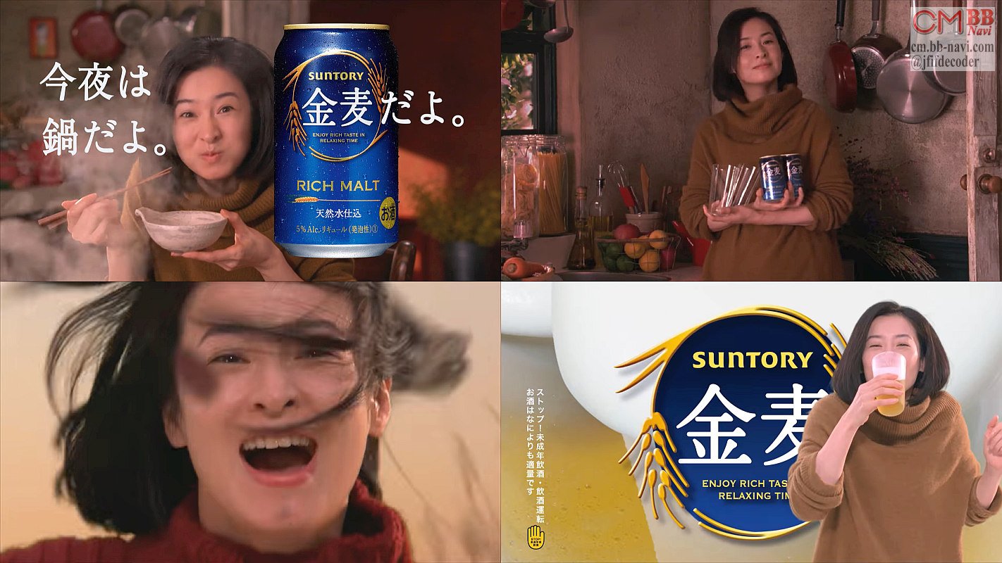 丘の上から手を振る妻役の女優の檀れいさんが「今夜は鍋だよ。金麦だよ」と語り、金麦とグラスを手に「明日も鍋だよ。明後日も明明後日もずーっとだよ」「うれしいでしょ」と言って、おいしそうに鍋を食べ、「〆は、(チ金麦鍋)だよ」と鍋にチキンラーメンを入れてチ金麦鍋にする、金麦のCMです。