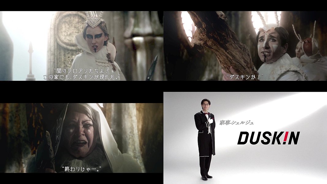 白い衣装でシロアリに仮装した外人女性と、部下のシロアリが会議してダスキンの事が話題になるダスキンのオペラ風CM。ディーン・フジオカさんは家事シェルジュ役で最後にチラッと登場します。