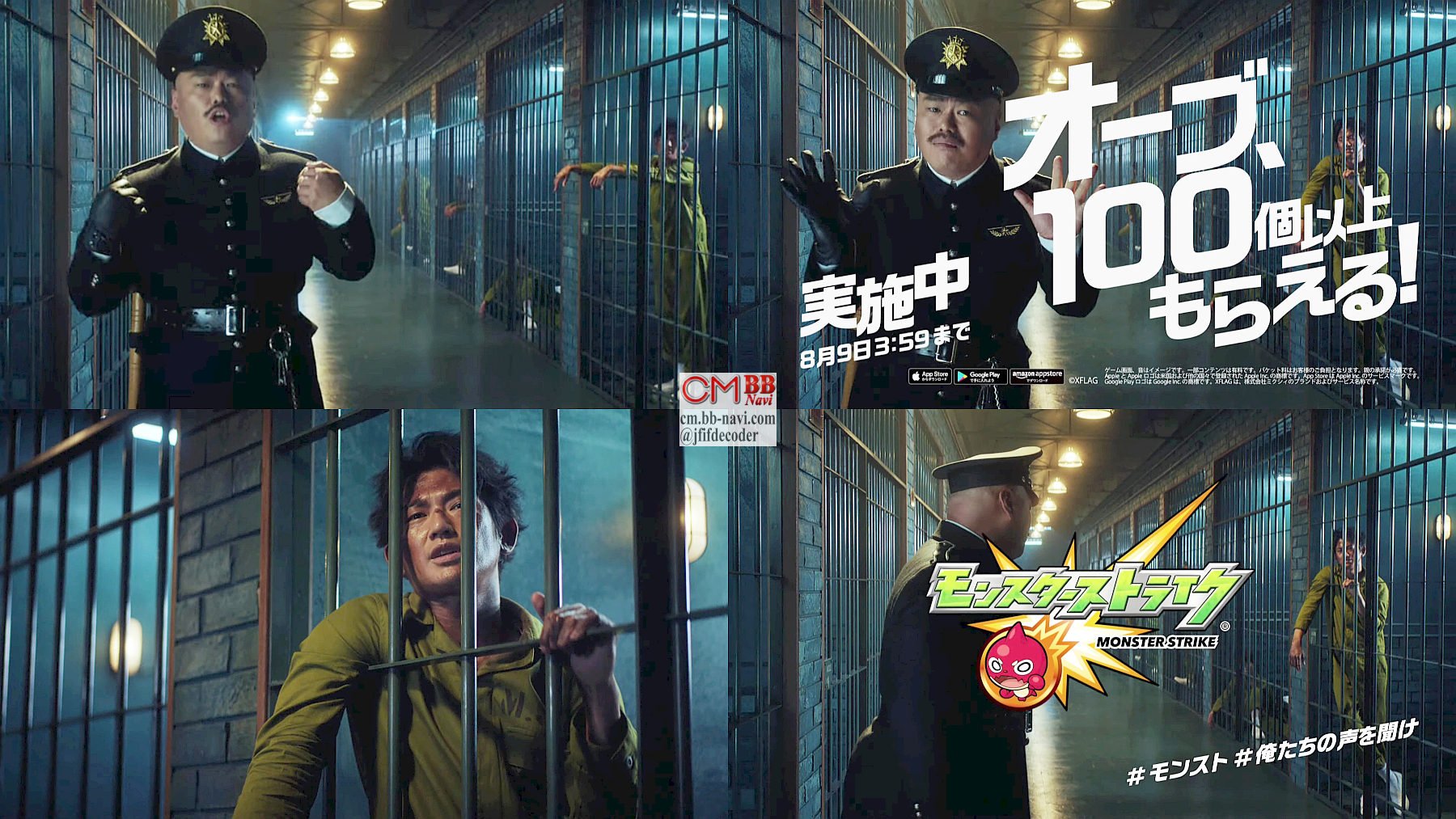 刑務所のモンストプリズンの所長役のクロちゃんが「オーブ100個以上あげるから」と言い、収監されている俳優の瑛太さんが「どうせまた嘘だろ?」と野次を飛ばせば「嘘じゃないし」と言い返す、モンストのCM 7/18〜版です。