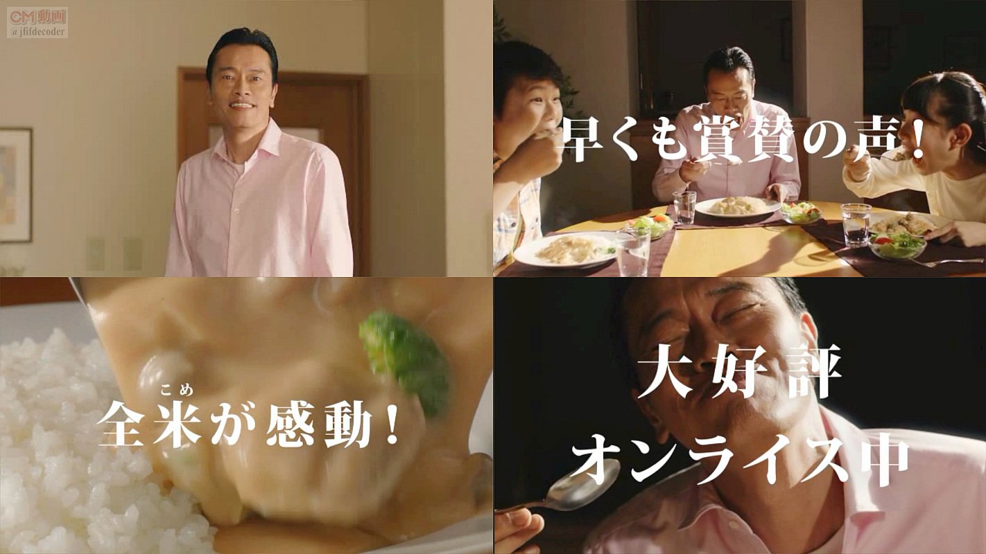 俳優の遠藤憲一さんが、ごはんにシチューをかけて食べる、シチューオンライスに、笑顔で「今日も?」「かけちゃおう」と、シチューをごはんにかけて食べる、シチューオンライスを家族全員で食べて「全米(ぜんこめ)が感動」「大好評、オンライス中」と言う、エリア限定で放送中のCMです。