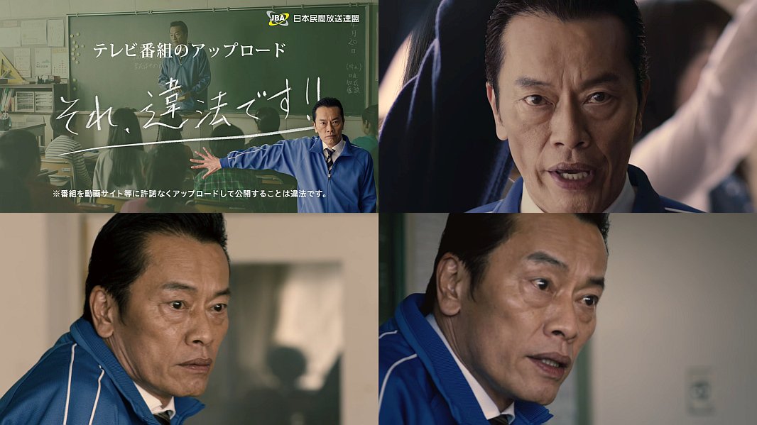 俳優の遠藤憲一さんが、教師に扮して、学校でヤンキー達に「テレビ番組を勝手にアップロードするのは違法だからな」「10年以下の懲役か1000万円以下の罰金か、その両方だ」と言って説教し、最後はヤンキーに説教される日本民間放送連盟のCMです。