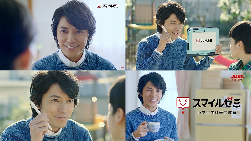 「算数苦手だね」と親子で悩む母のところへ青いセーターを着た俳優の藤木直人さんが「そんな事より勉強は紙と鉛筆でするものだと思ってませんか?」と言って突然現れ、タブレットで学ぶ小学生向け通信教育スマイルゼミを教えて、優雅にお茶を飲んでる、スマイルゼミの限定配信中のCMです。