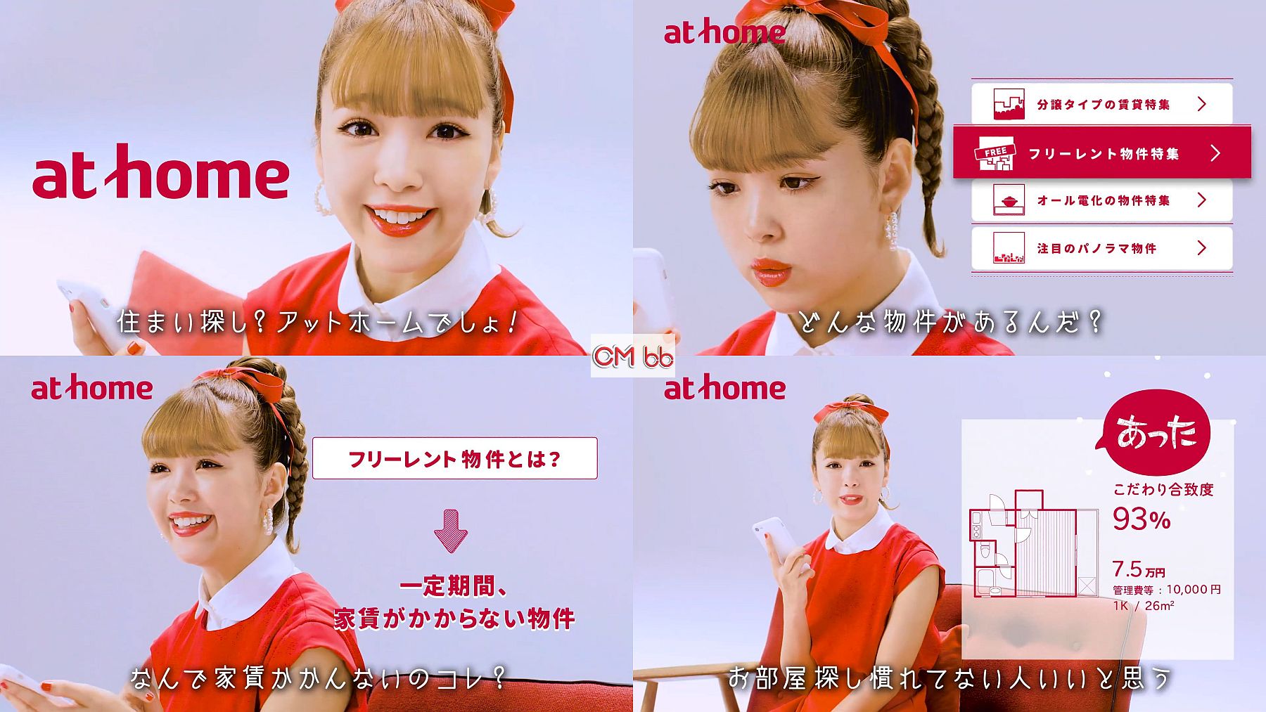 ポニーテールを編み上げた髪型の赤いワンピの藤田ニコルさんが、アットホームの社会人向けアプリで部屋を探しながら驚く、ウェブCMです。