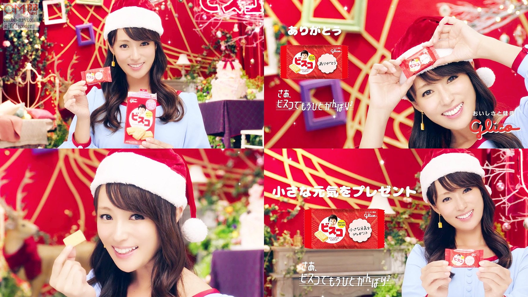 サンタ帽をかぶった女優の深田恭子さんが「クリスマスにはビスコをおくろ」と登場し「感謝のしるしです」とこそっと言う、ビスコの短い6秒のCMです。