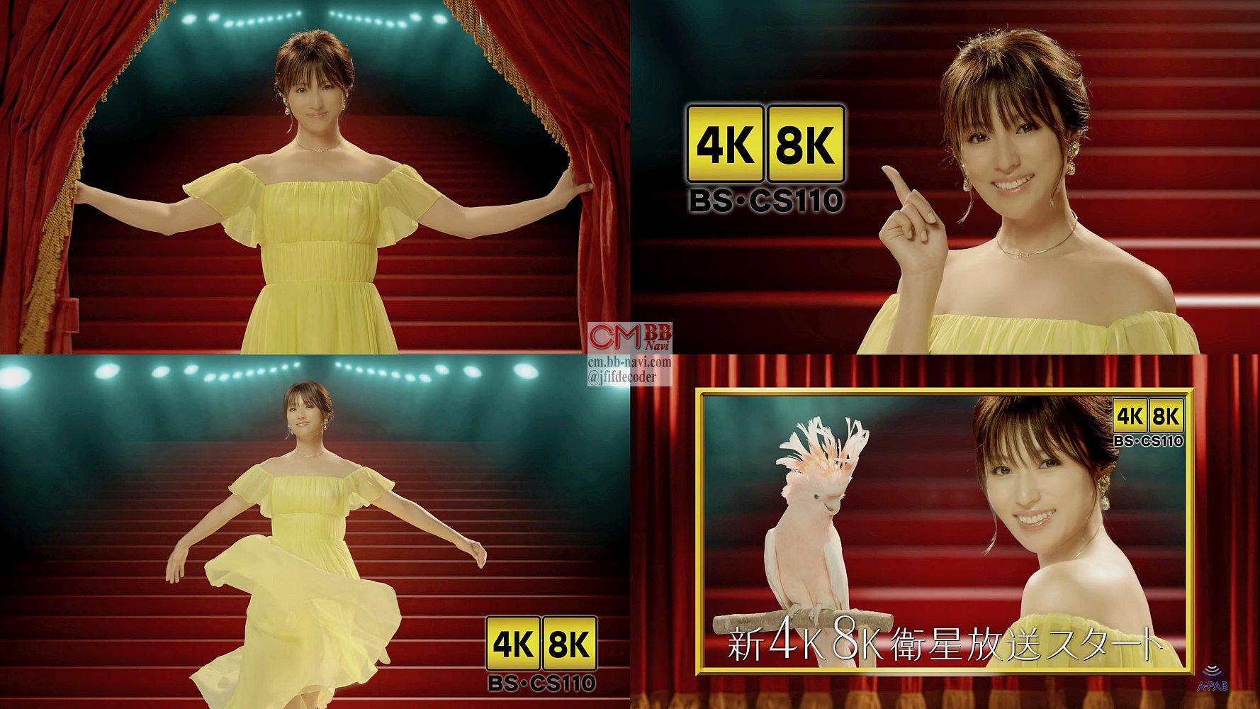 4K8K推進キャラクターの深田恭子さんが肩を出した黄色いドレスを姿で舞台の緞帳のような赤い幕を開けて「さぁ、もーっと綺麗なテレビの始まりでーす」と登場し、「新4K8K衛星放送をぜひお楽しみください」と階段を降りて、ターンをして、「今度のテレビは別世界」と言うと、オウムも「別世界」と言う、一般社団法人放送サービス高度化推進協会のCMです。