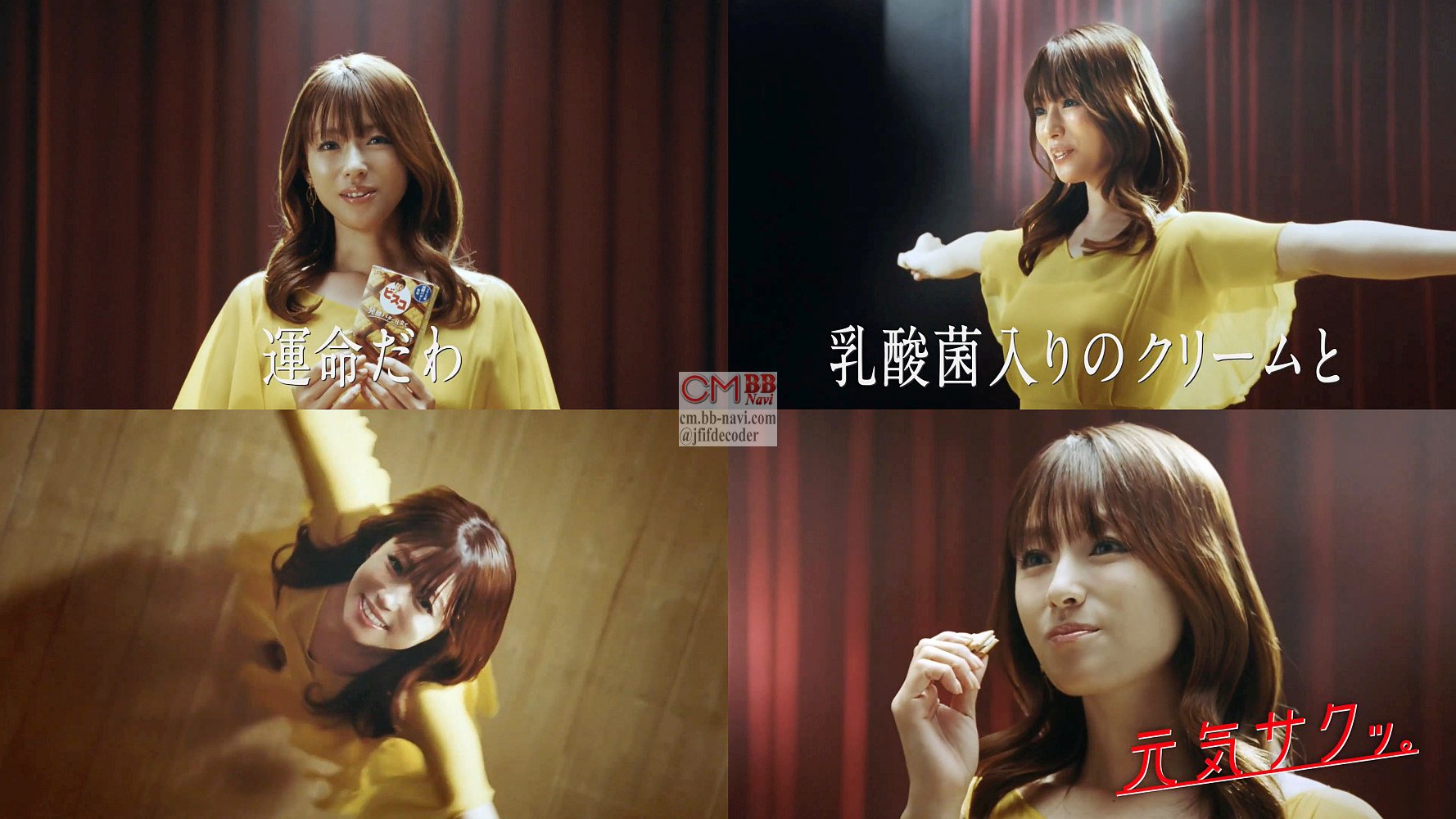 黄色いドレス姿の女優の深田恭子さんが「運命だわ」とステージの上に現れ、フランス産発酵バター入りの濃厚な旨みのあるビスケットと、乳酸菌入りのクリームが出会い、ビスコ 発酵バター仕立てが出来た事を紹介して、「おおビスコ。大人においしいこんなビスコがあったなんて」と言って一口食べ「元気サクッ」と言います。