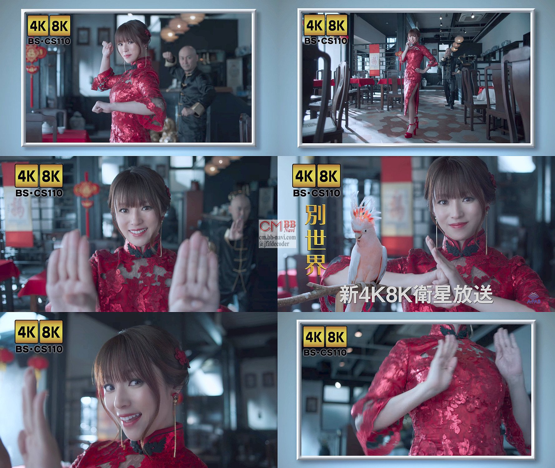 4K8Kの事を会話する老夫婦に、TVの中からチャイナドレス姿の女優の深田恭子さんが「もう始まってますよ」と話しかけてきて、カンフーアクション風のポーズをして「その目で、ぜひ」と言い、老夫婦が「見に行くか?電気屋さん」と会話し、最後にオウムが「別世界」と言う、一般社団法人放送サービス高度化推進協会のCMです。