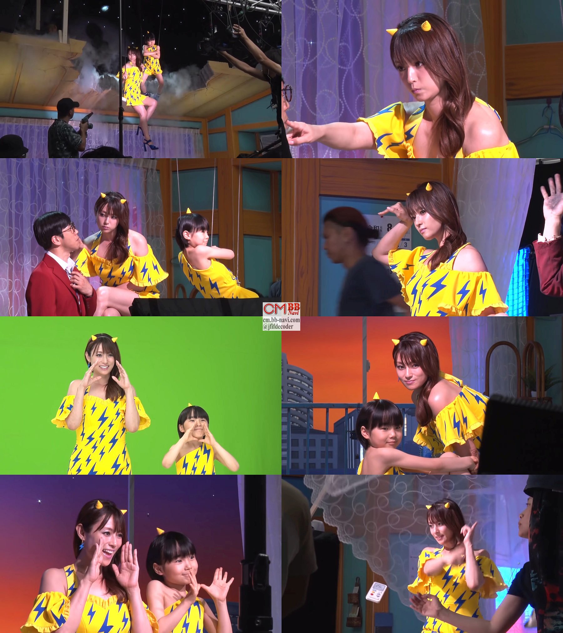 47秒からのメイキングでは、スタジオ入りしたラムちゃん役の深田恭子さんとテンちゃん役の寺田心君が、合成では無く実際にワイヤーで吊られての登場シーンの撮影や、男性と絡みのシーンや、寺田心君がテンちゃんの大阪弁を練習するシーンや、男性が電撃でショックを与えられるシーンや、二人が替え歌を歌って踊るシーンなどの撮影の模様が見れます。