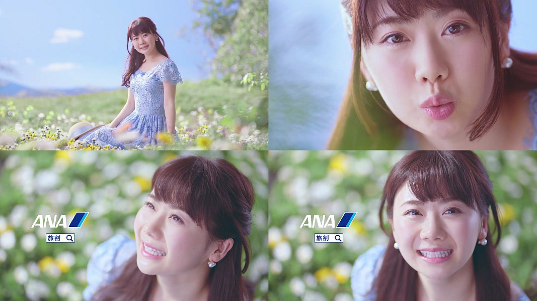 レースの水色のドレスを着た卓球選手で新婚の福原愛さんが、「一度きりだよ」「今年の大型連休はたった一度きり」と登場し、花の上の小さな飛行機に「飛行機くん、君の出番だよ」と顔アップで息を吹きかけると飛行機が一斉に飛び立ち「とんじゃえ、ゴールデンウィーク」と言う、ANAのCM動画です。