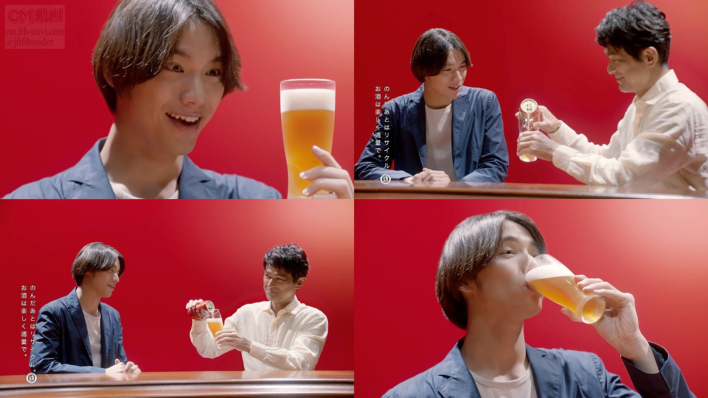 俳優の福士蒼汰さんが先輩俳優の江口洋介さんに本麒麟をすすめられて飲み「これ、うまい」と微笑む、本麒麟のCMのメイキング動画。